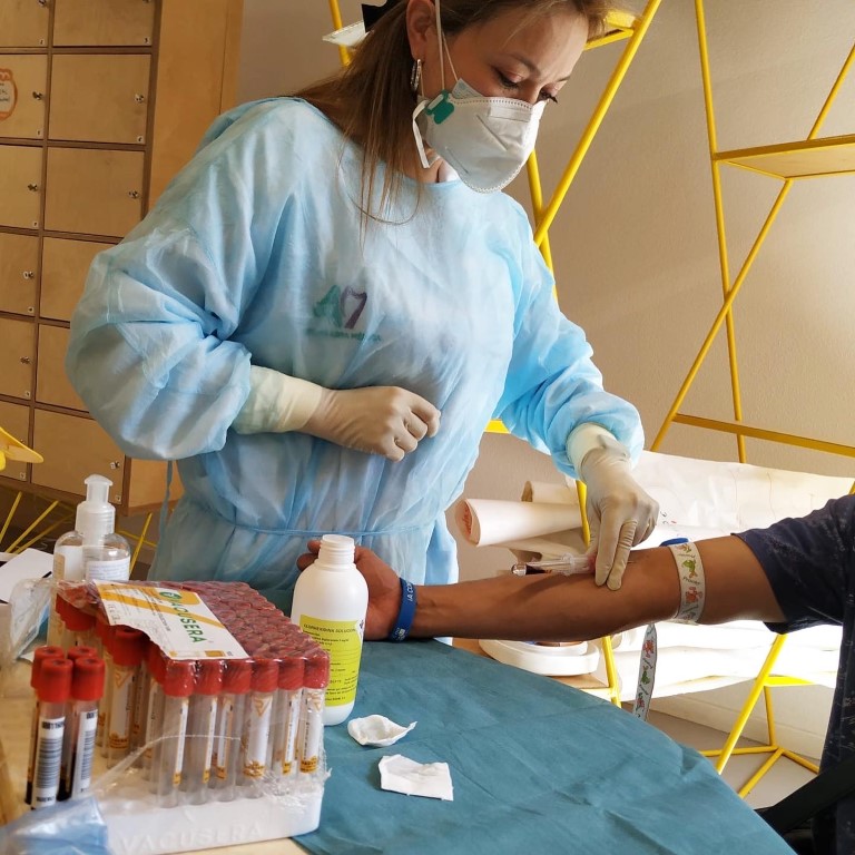 Por ello, el pasado viernes, el Grupo Arpa Médica y la Fundación Dr. Palomo hizo llegar a esta organización un equipo de profesionales sanitarios para que pudiesen realizar a todo su personal de cocineros el test por técnica Elisa, siendo uno de los exámenes más exhaustivos para la detección de la Covid-19. Por ello, los profesionales del Grupo Arpa Médica se trasladaron hasta el lugar para tomar muestras de sangre que posteriormente mandarían a sus propios laboratorios. Haciendo así posible que los cocineros puedan seguir trabajando con las mejores precauciones, ya que del servicio que realizan dependen muchas familias que en estos momentos tienen pocos recursos.